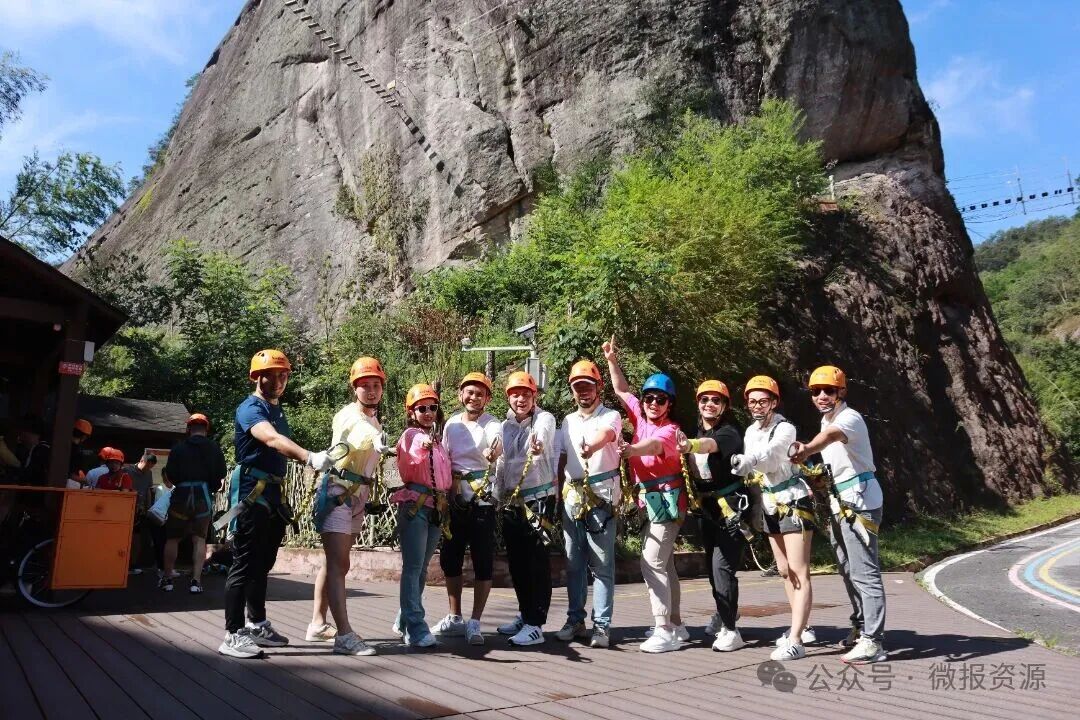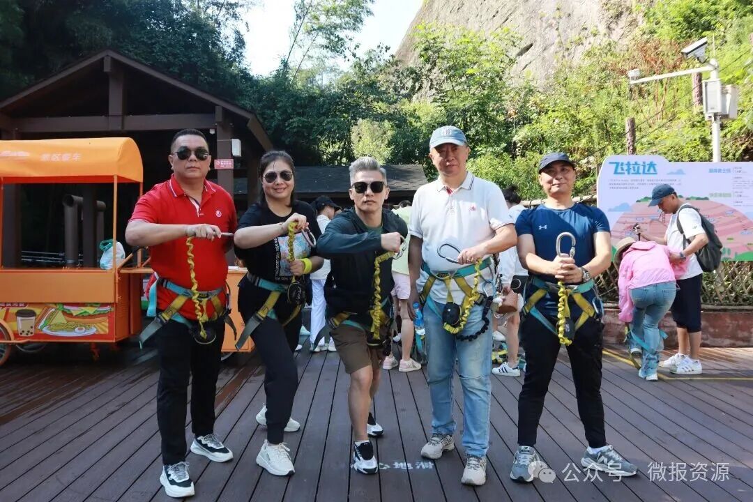 8月30日上午,考察团走进桂林丹霞・古木冲景区。该景区与桂林丹霞・八角寨隔山相望,最高海拔616米,以丹霞地貌为依托,打造“爱情+亲子户外”主题乐园。雨后云雾中,相思湖、相思石与比翼鸟丹霞奇石、“一吻千年” 岩雕、山盟海誓台等10余处景观相映成趣。 步道沿途,无动力设施精彩纷呈:丛林穿越穿梭林间,飞拉达紧贴崖壁,悬崖咖啡云端飘香,空中爬网童趣十足,玻璃栈道尽览丹霞。景区完备的观景台、休息驿站等配套,兼具景观特色与亲子互动性,是吸引大湾区家庭和年轻情侣的理想打卡地。
