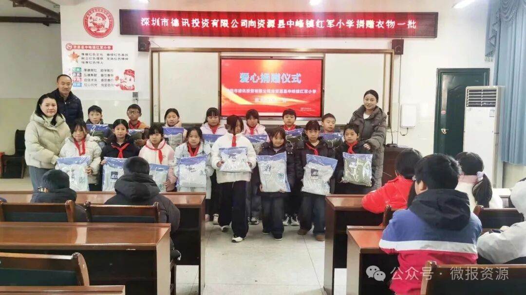 1月8日,深圳市德讯投资有限公司联合深圳市南山区慈善会向中峰镇红军小学捐赠一批爱心衣物,并在该校大会议室举行爱心捐赠仪式,为学生们送去冬日里的温暖与关怀。