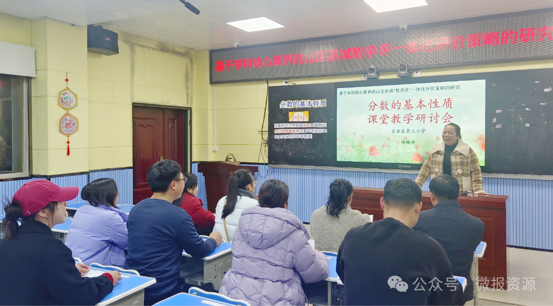 活动中,课题组负责人解读了“教学评一体化”的核心概念、研究目标,明确课堂教学中的评价应贯穿教学全过程,成为诊断学情、优化教学设计、提升教学质量的重要抓手。同时,课题组负责人分享展示了精心设计的公开课《分数的基本性质》,教学过程中充分体现了“教师评、学生自评、师生互评和生生互评”以评促教的教学理念。