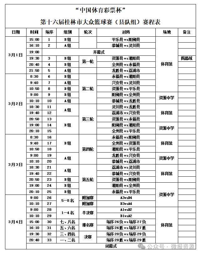 “中国体育彩票杯”第十六届桂林市大众篮球赛(县队组)赛程表