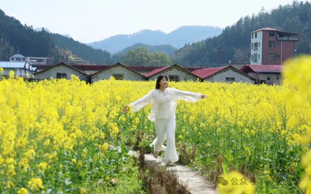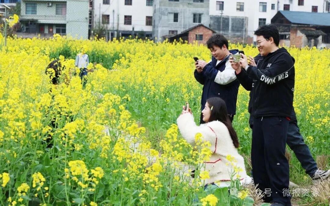 漫步在大田村富硒稻种植基地,连片油菜花迎风摇曳,与青山、村落、田园相映成趣。微风拂过,花浪起伏,花香四溢,蜜蜂穿梭花间,漫步田埂仿若置身金色海洋。游客们或举着手机、相机定格美景,或结伴漫步花径闲谈欢笑,尽情沉醉在春日田园风光中。