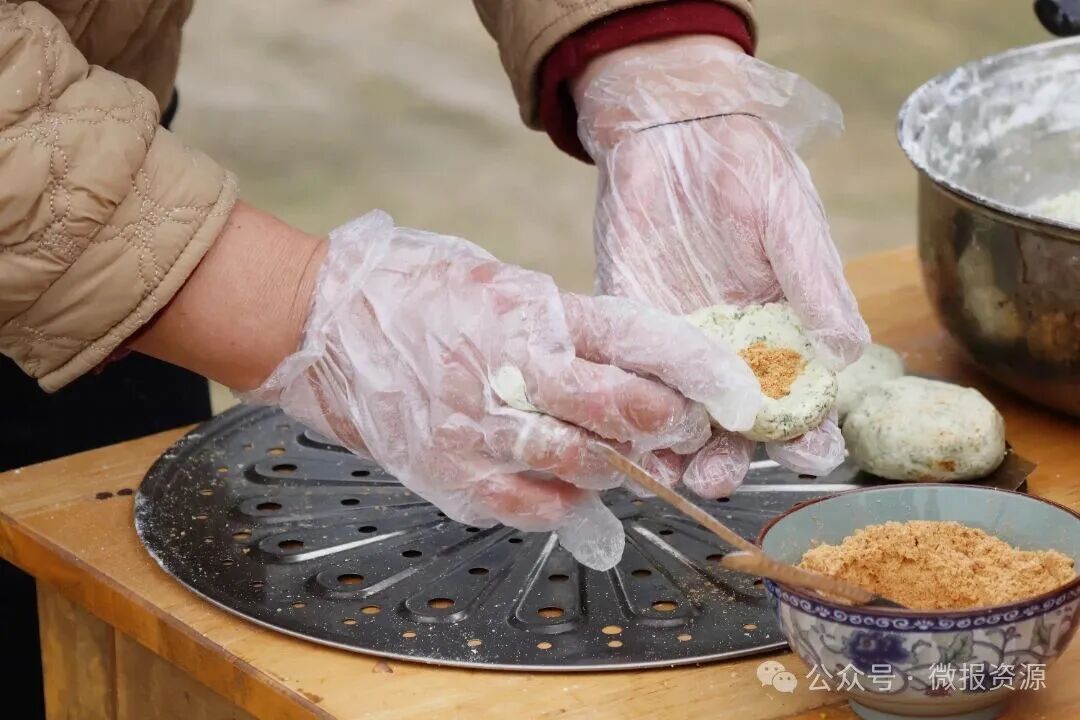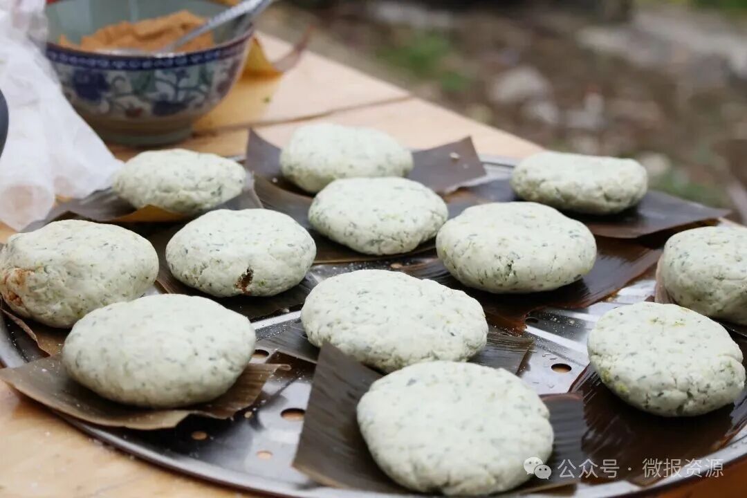 每到晴好春日,村民们便挎着竹篮进山,采摘田埂山坡间鲜嫩的燕子花,经反复清洗、焯水去涩、细细剁碎后备用。选用细腻优质糯米粉,加入山泉水与剁好的燕子花反复揉成青绿软糯的粉团,再包入经文火炒香、磨碎的黄豆粉馅料,捏成圆润饼状,垫上煮过的竹叶。既可清蒸锁鲜,亦可香煎、油炸入味,工序朴实精巧,却满是乡土匠心与春日风味。